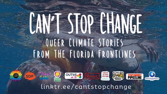 Hear interviews with LGBTQ2S+ artists, organizers, and educators across Florida in the intersectional climate justice narrative "Can't Stop Change", followed by lunch and discussions about the intersection of queer identity, politics, and sustainability in a rapidly changing world.