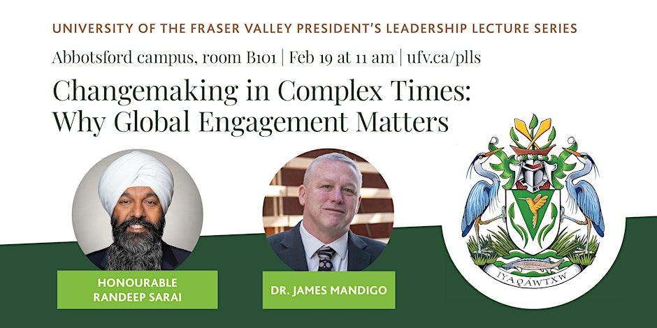 Join Dr. James Mandigo for a compelling edition of the President’s Leadership Lecture Series, featuring a keynote address from the Honourable Randeep Sarai, Secretary of State for International Development and Member of Parliament for Surrey Centre.